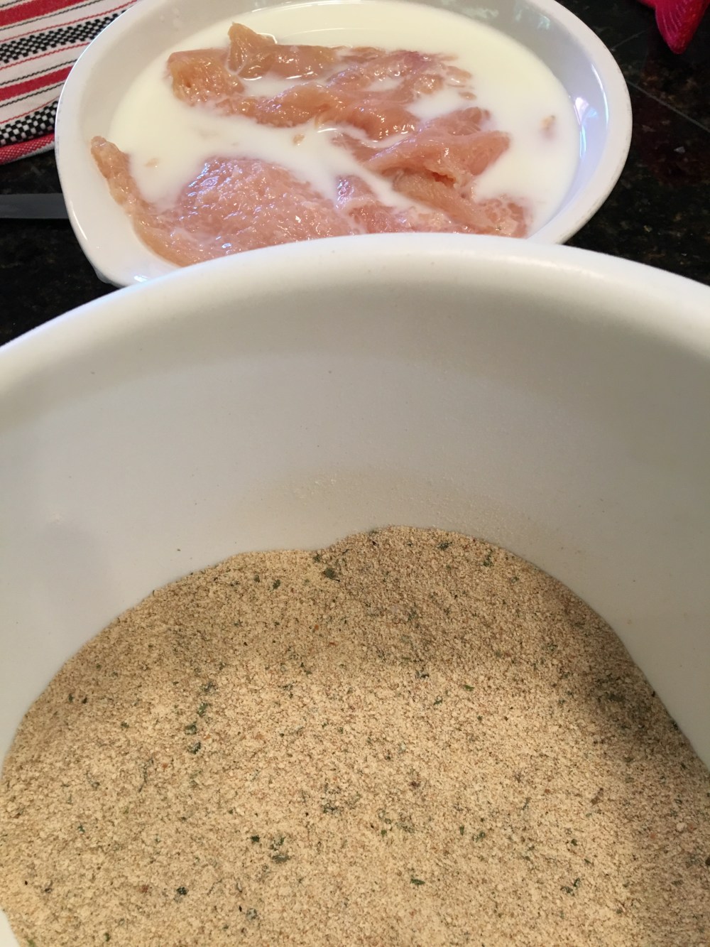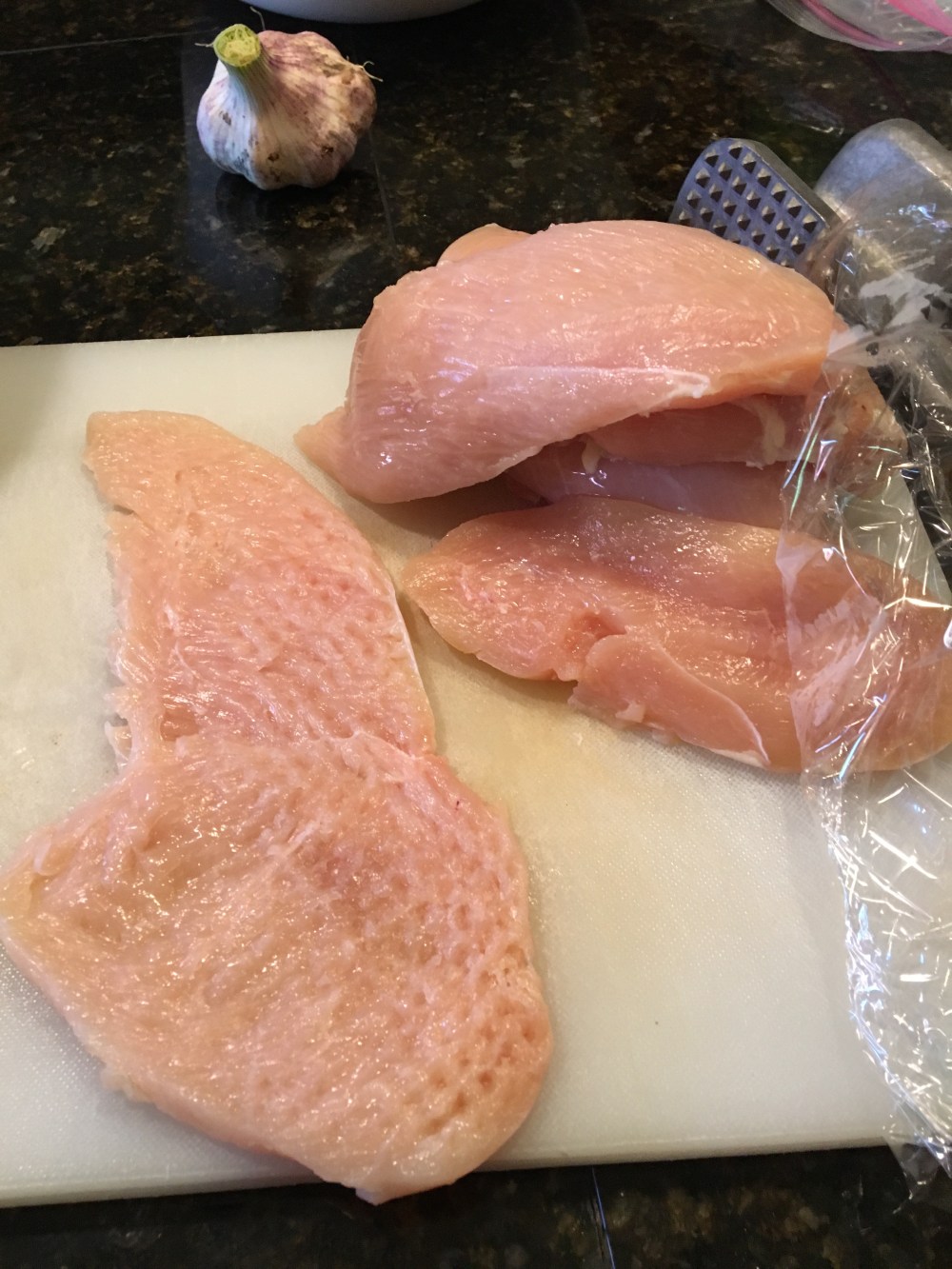 Trim fat and slice chicken breasts in halves. Long ways so to make thin steaks
