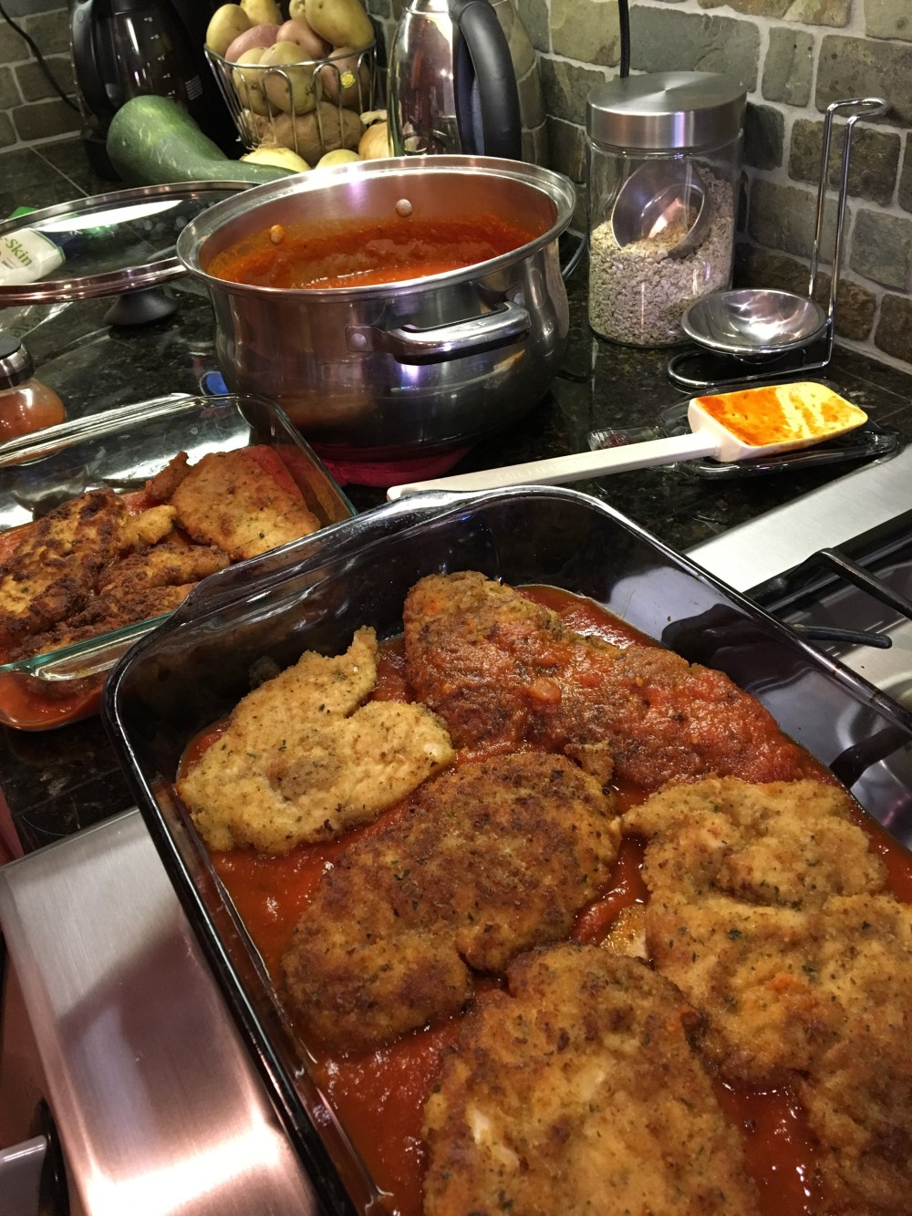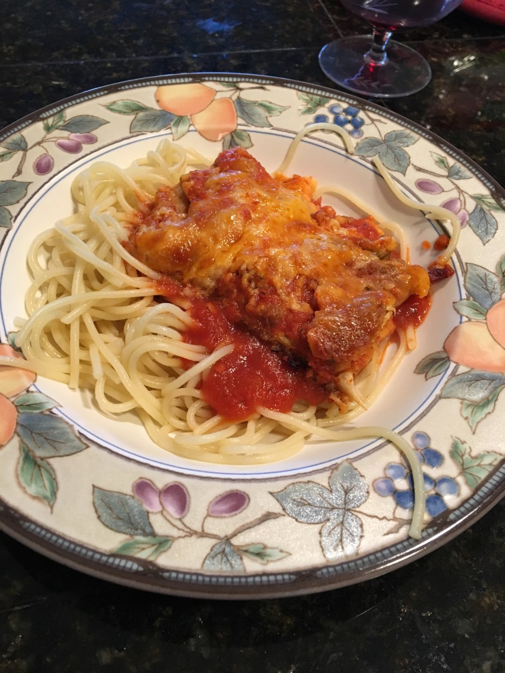 Mom would make big pots of spaghetti and meatballs to fill us farm kids up. She dump it in a huge bowl on the table and we would get our fill of big meatloafy meatballs and cheese from a green shake can. Years later I added the chicken for a alternative to beef. This meal makes an easy weekend prep for weeknight meal heatups.