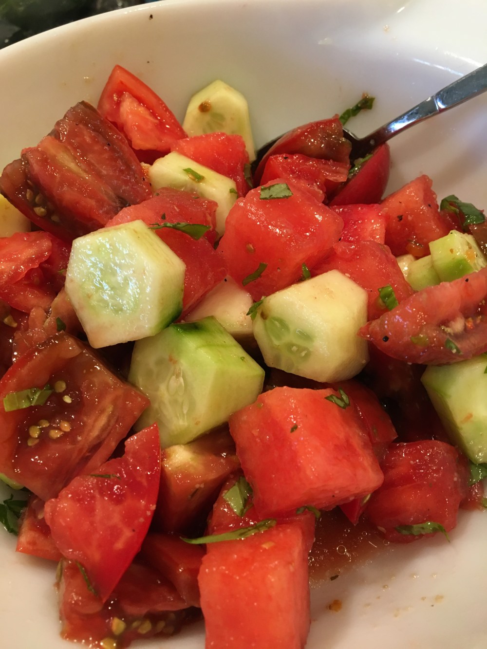 Chunky chop cucumbers, watermelon and tomatoes. Chop 8 fresh leaves of sweet basil. I grow my own for fast easy access. Dash a tablespoon of light vinaigrette dressing, or oil and balsamic. Toss and allow to season an hour in fridge before serving. Yum! Add chunks of fresh mozzarella for a twist.
