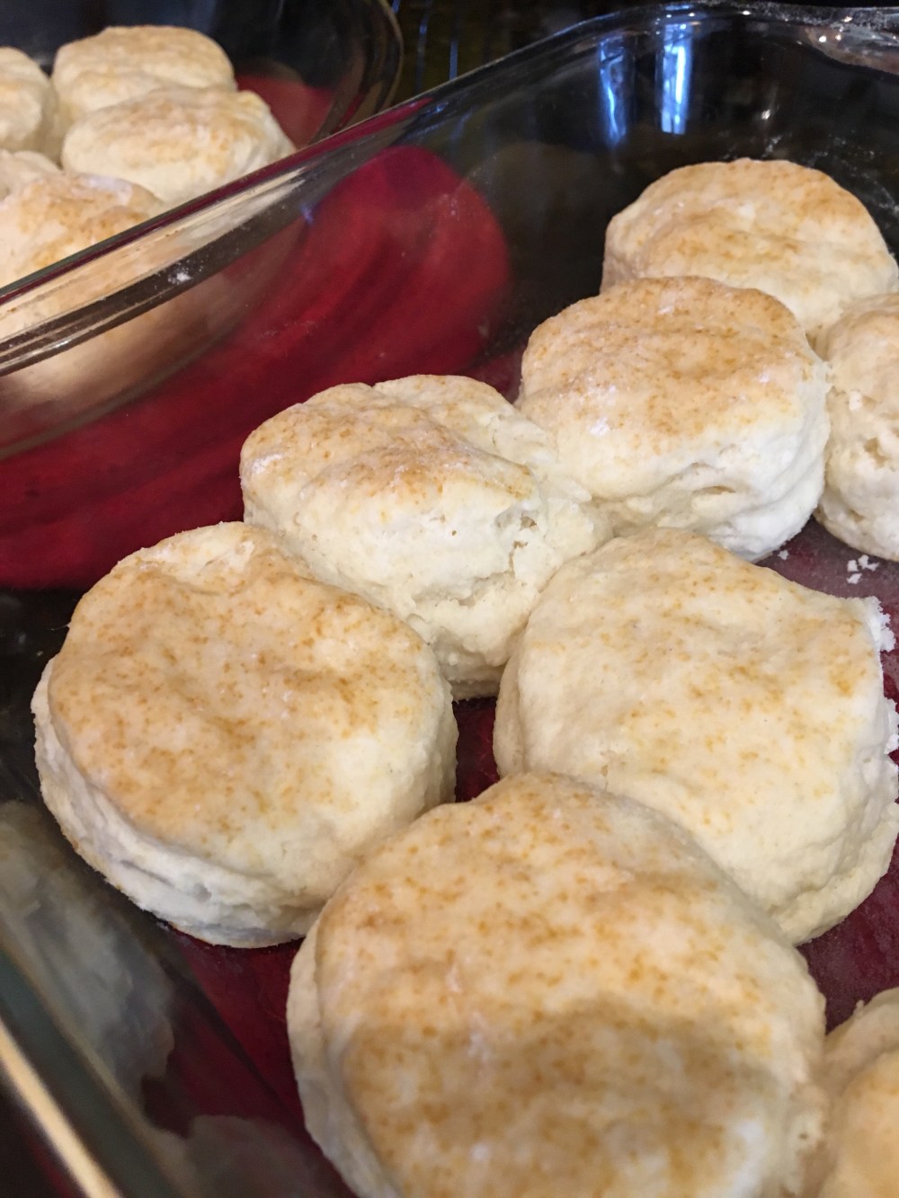 Roll out to inch thickness and biscuit cut rounds with cutter, glass or do squares with a knife. Place in buttered glass baking dish.