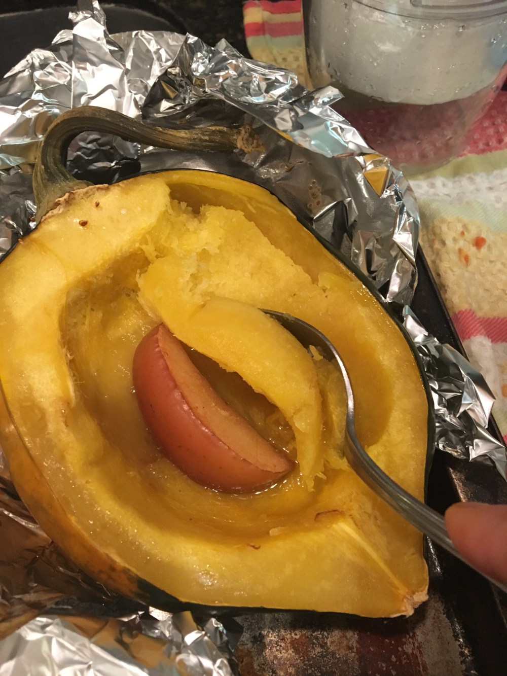 Roast squash halved and cleaned with apple wedge and dash oil incenter until tender.