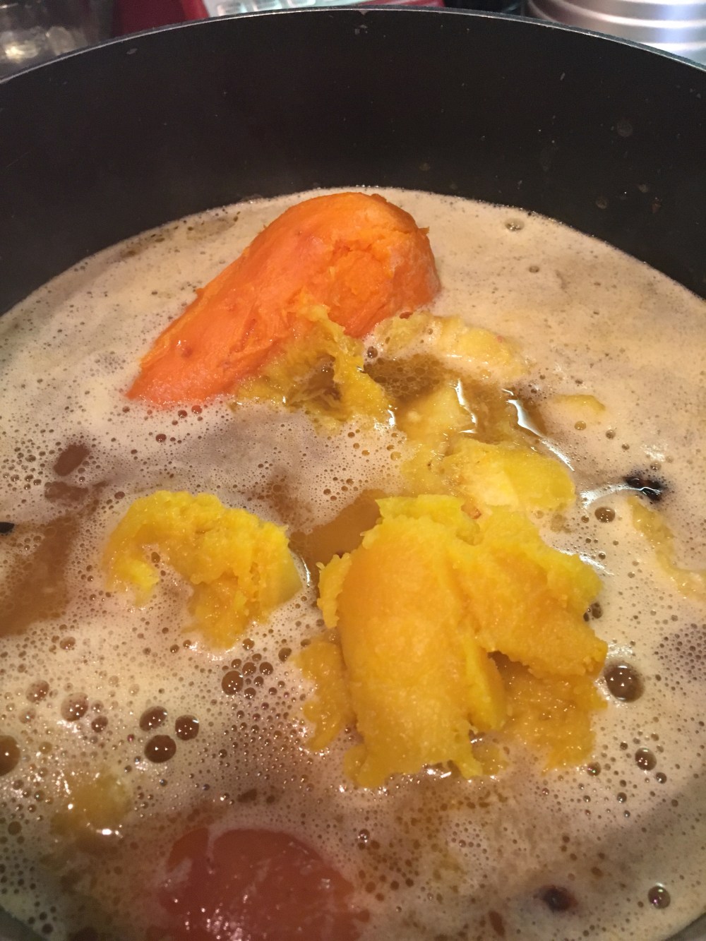 Bring to boil add cinnamon, and purée. Add coconut milk. Bring up to temp simmer and serve hot.