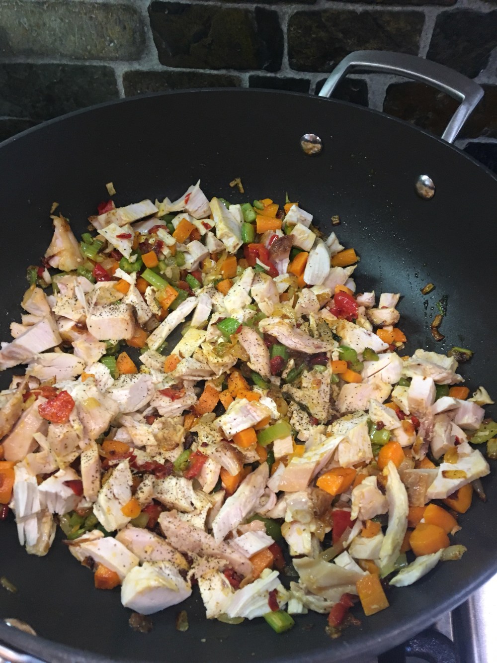 I large pan sauté veggies w oil until past wilt and starting to caramelize. Add chopped chicken and combine with spices and pepper.