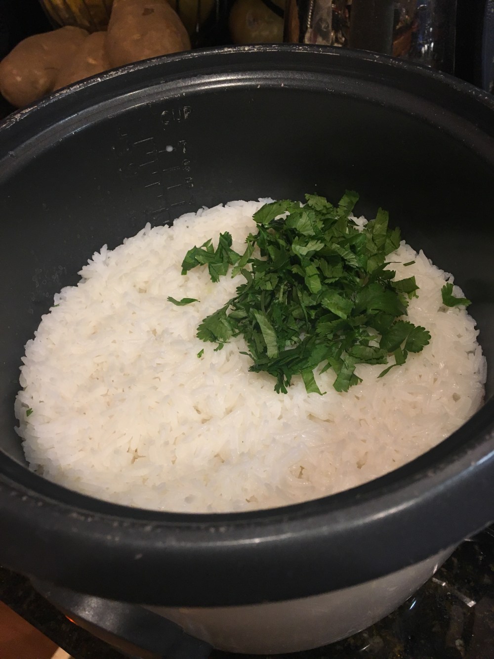 Rice steamed- fork toss with coconut milk and cilantro and lime juice.
