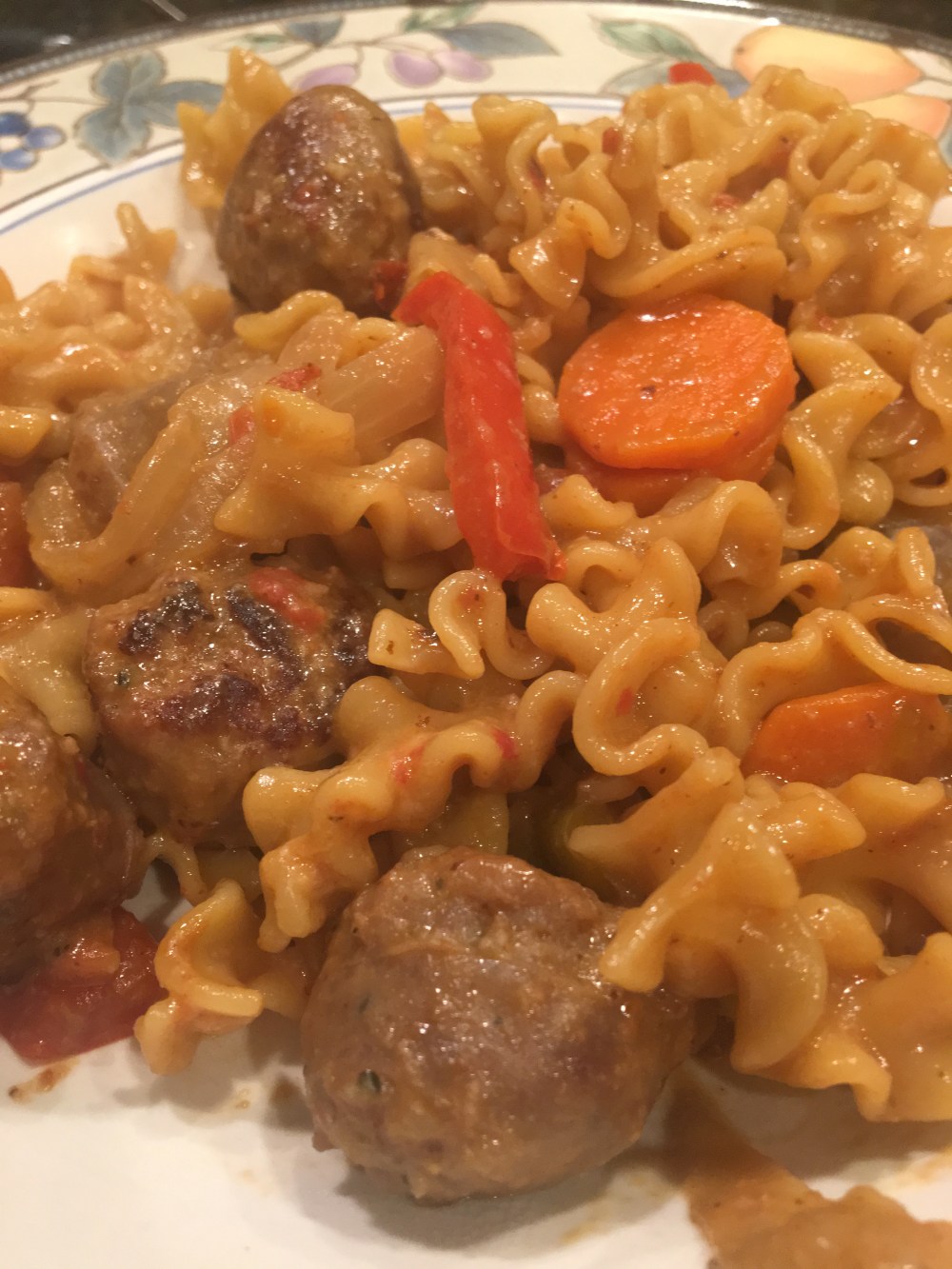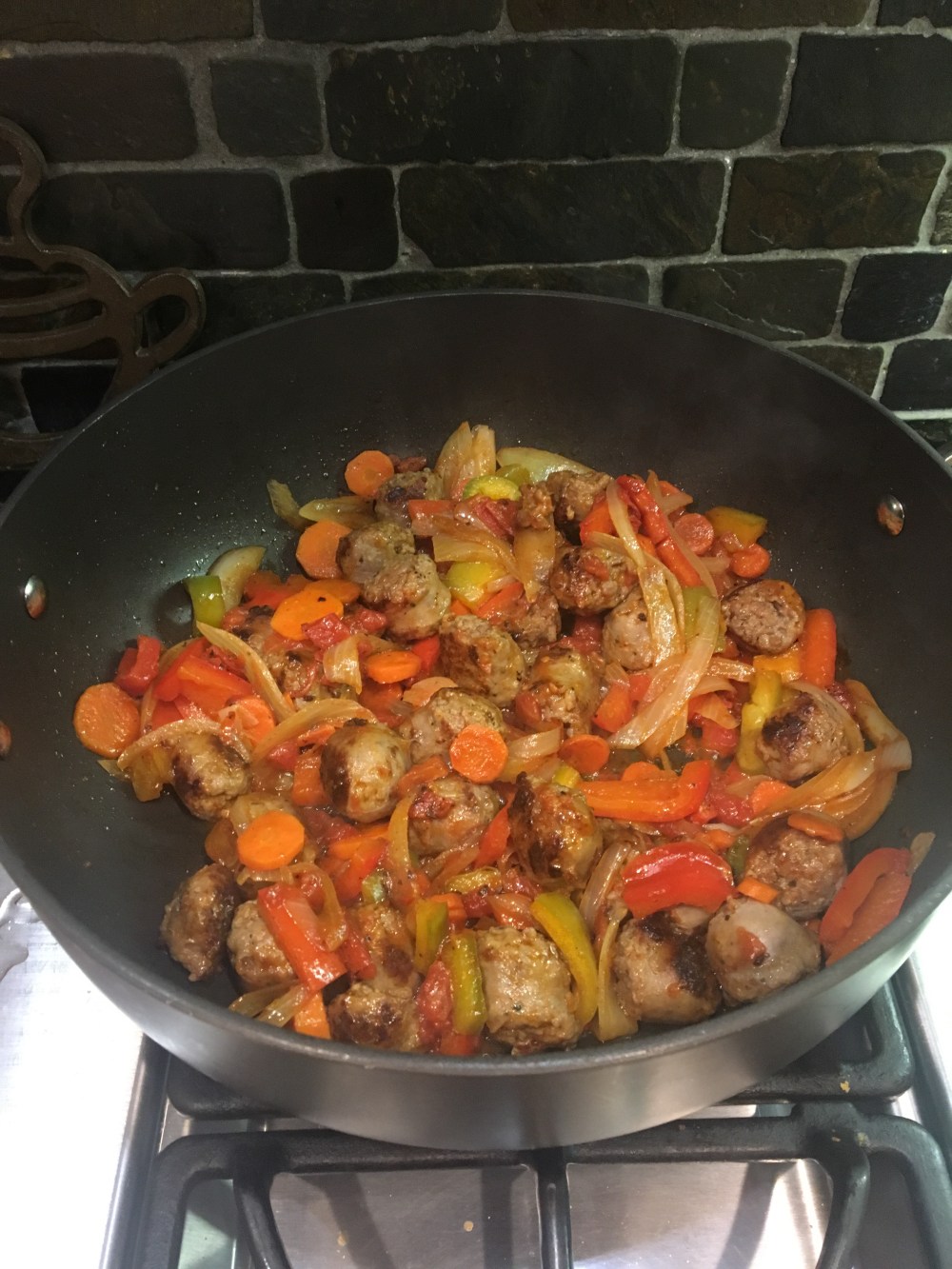Cook sausage til near cooked add all veggies. Stir fry til limp 10 min.