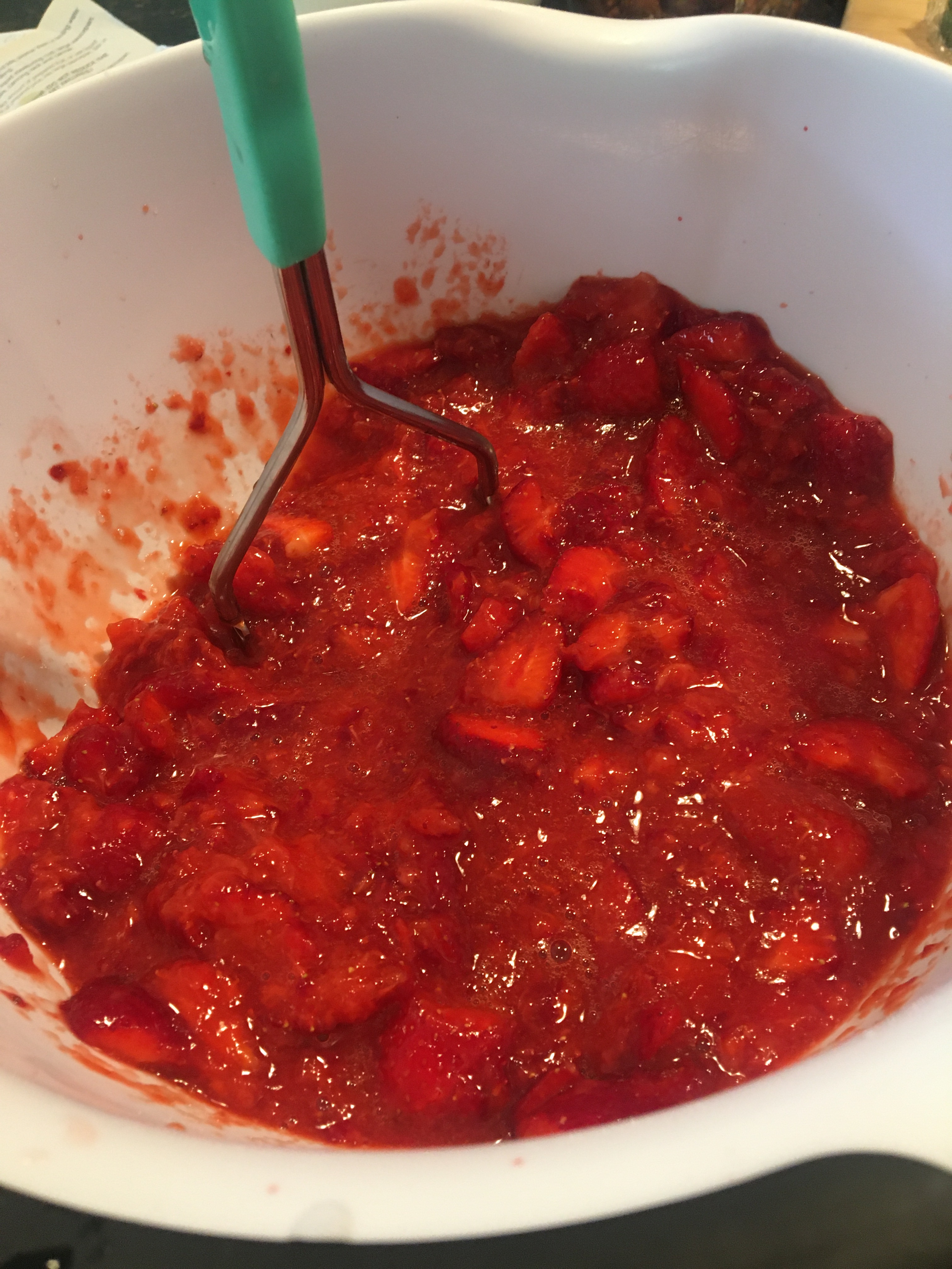 Prep fruit. Clean and slice strawberries. Mash in bowl to desired consistency. I like big strawberry chunks in my jam.
