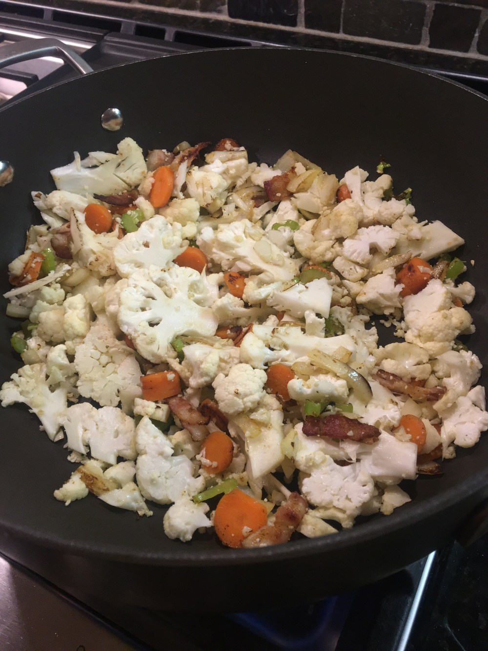 Cook bacon til partial done add vegetables less corn.