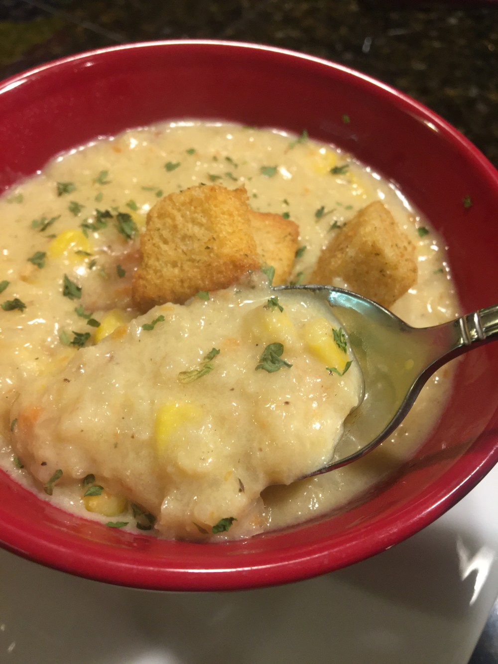 Serve with garnish of parsley and croutons.