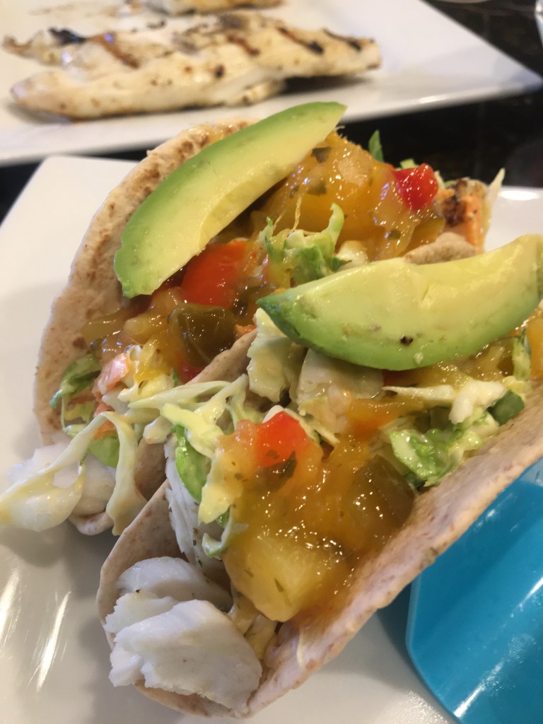 Simple and oh so good is this dinner favorite at my house. Chopping up a simple slaw and grilling fat fillets under 10 minutes makes a bright healthy option for summertime dinner. I always have a nice mango salsa on hand in the pantry and a few lime wedges top it all off well.