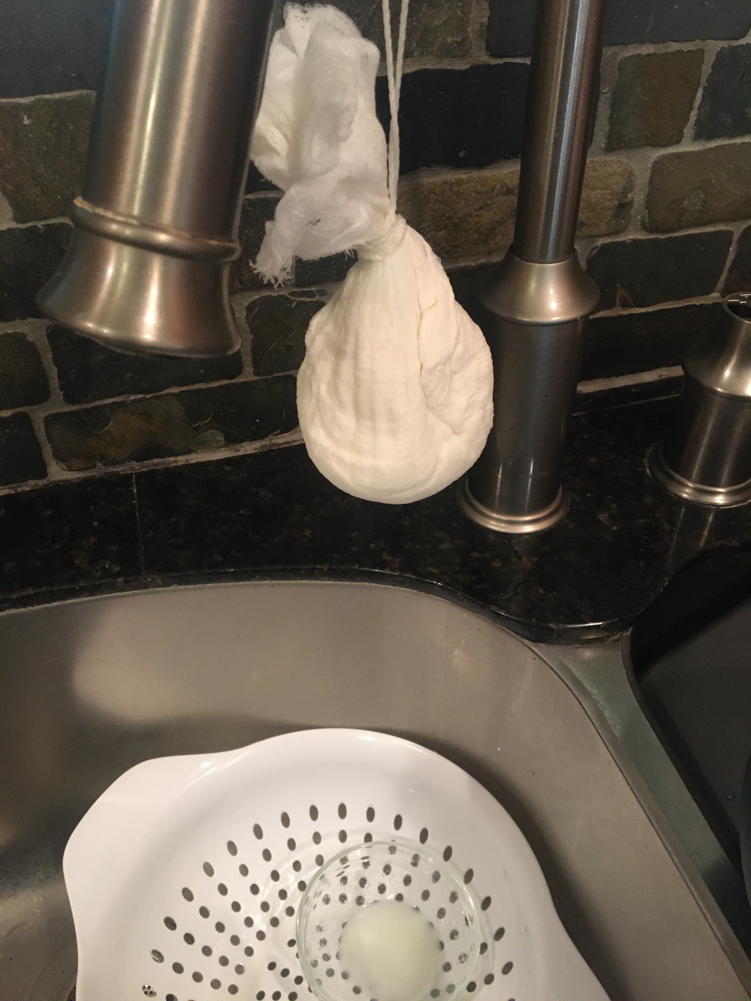 Carefully ladle in milky cheese into colander to not run over edges of cloth. Cheese will slowly seperate and whey water will run off bottom clear.