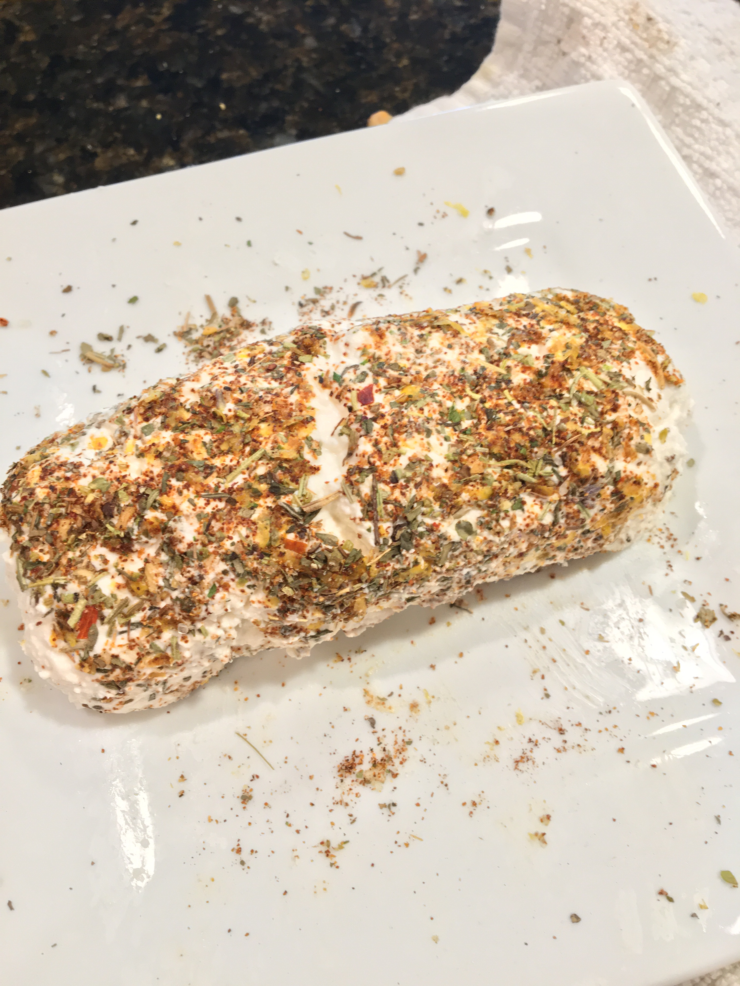 Prepare herbs to role the cheese in. My lemons were so floral and fresh I did lemon zest, parika, herb de province , pepper and garlic powder.