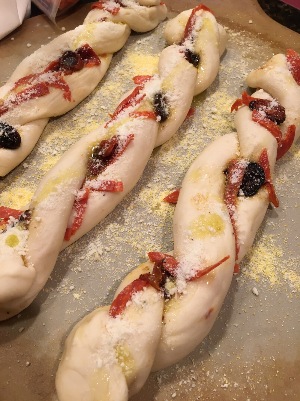 What an easy side to any Italian meal. I took advantage of having fresh pizza dough (herb from trader joes $1.29) and added my homemade oven roasted tomatoes in olive oil, parmesan cheese and mozzarella. Twist and bake 12 min 425. Delish!