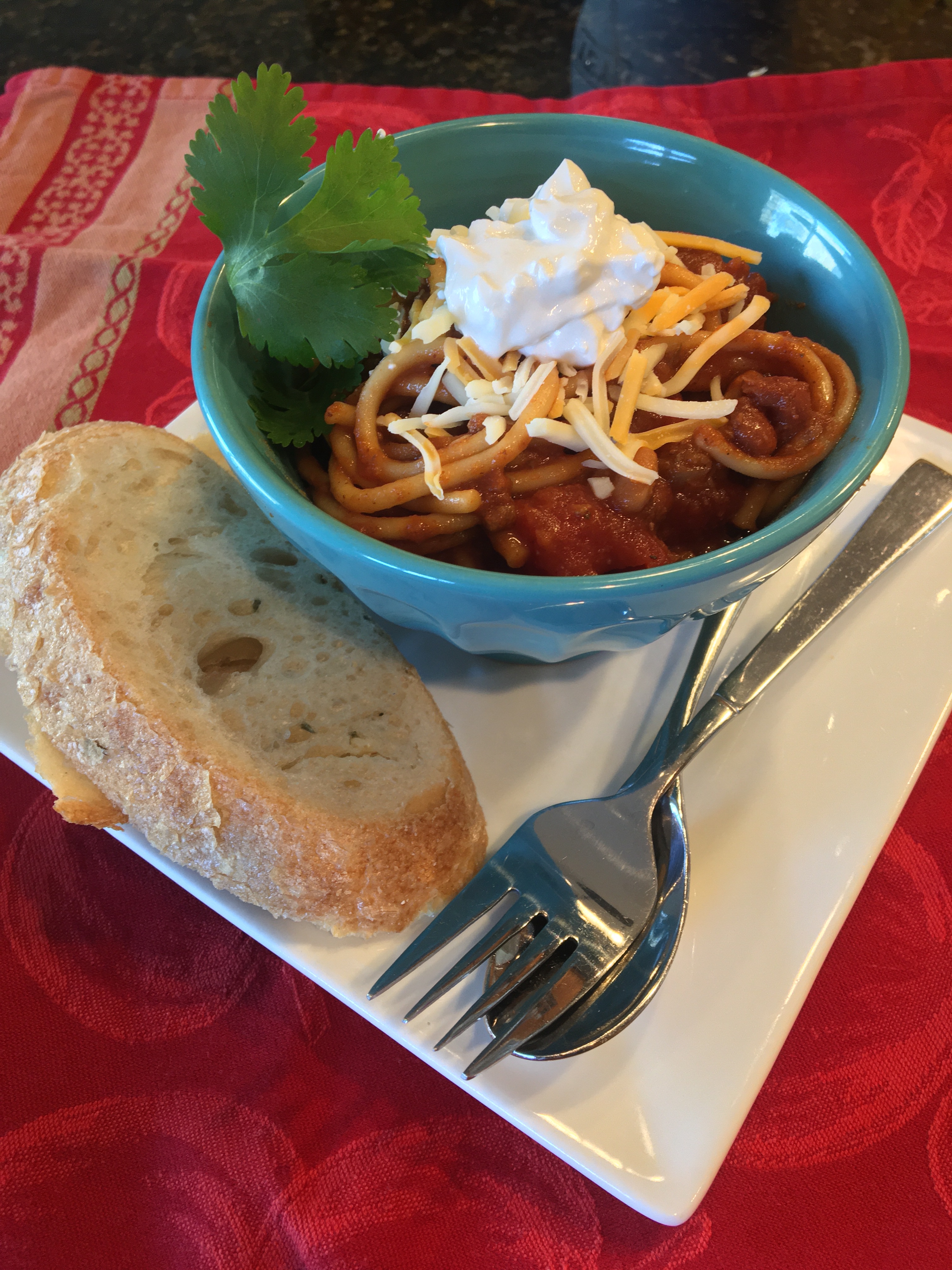 Add 1/2 box pasta broken in half. Stir into hot chili well so noodles dont stick. Pressure 4 minutes.
