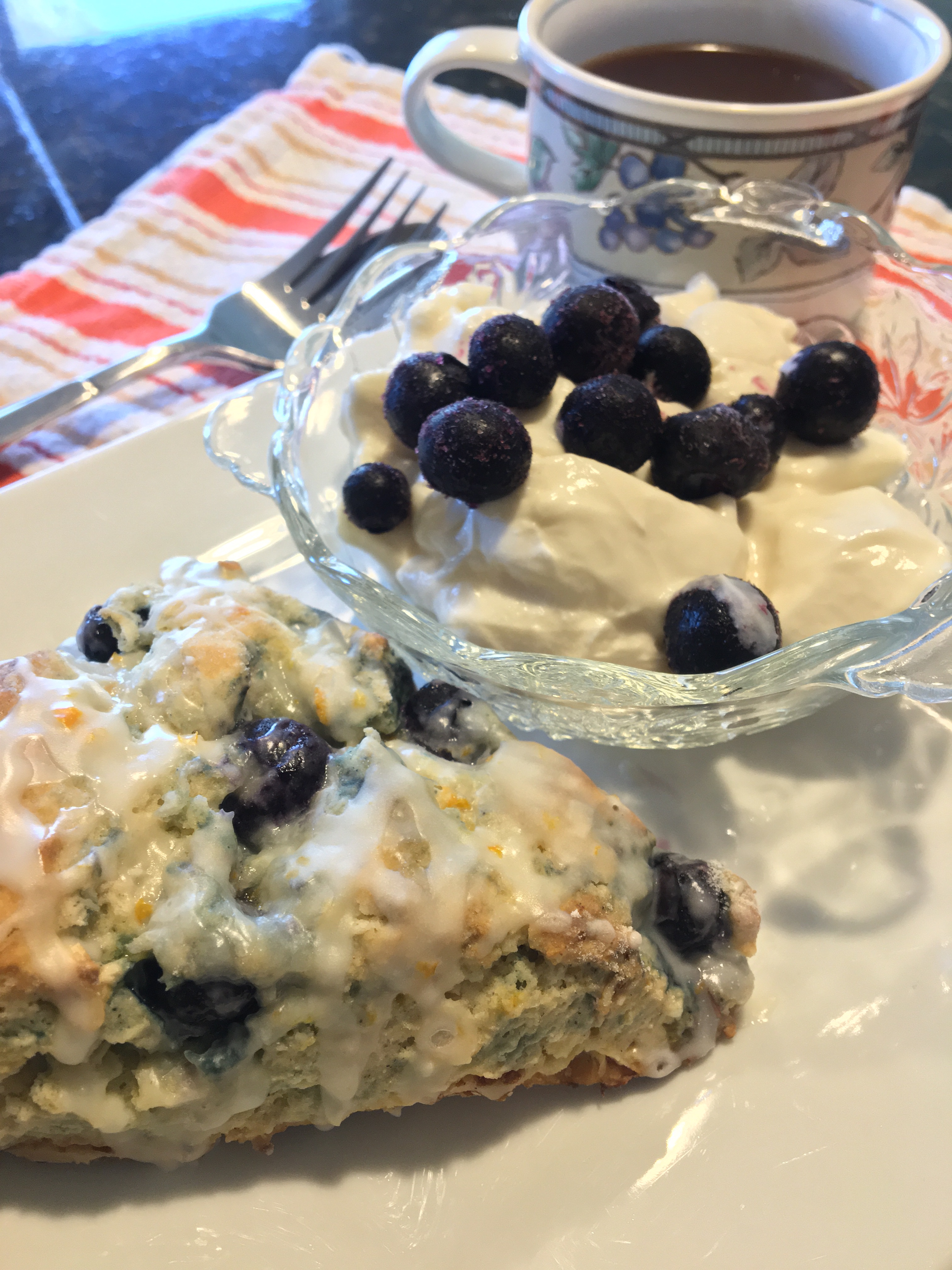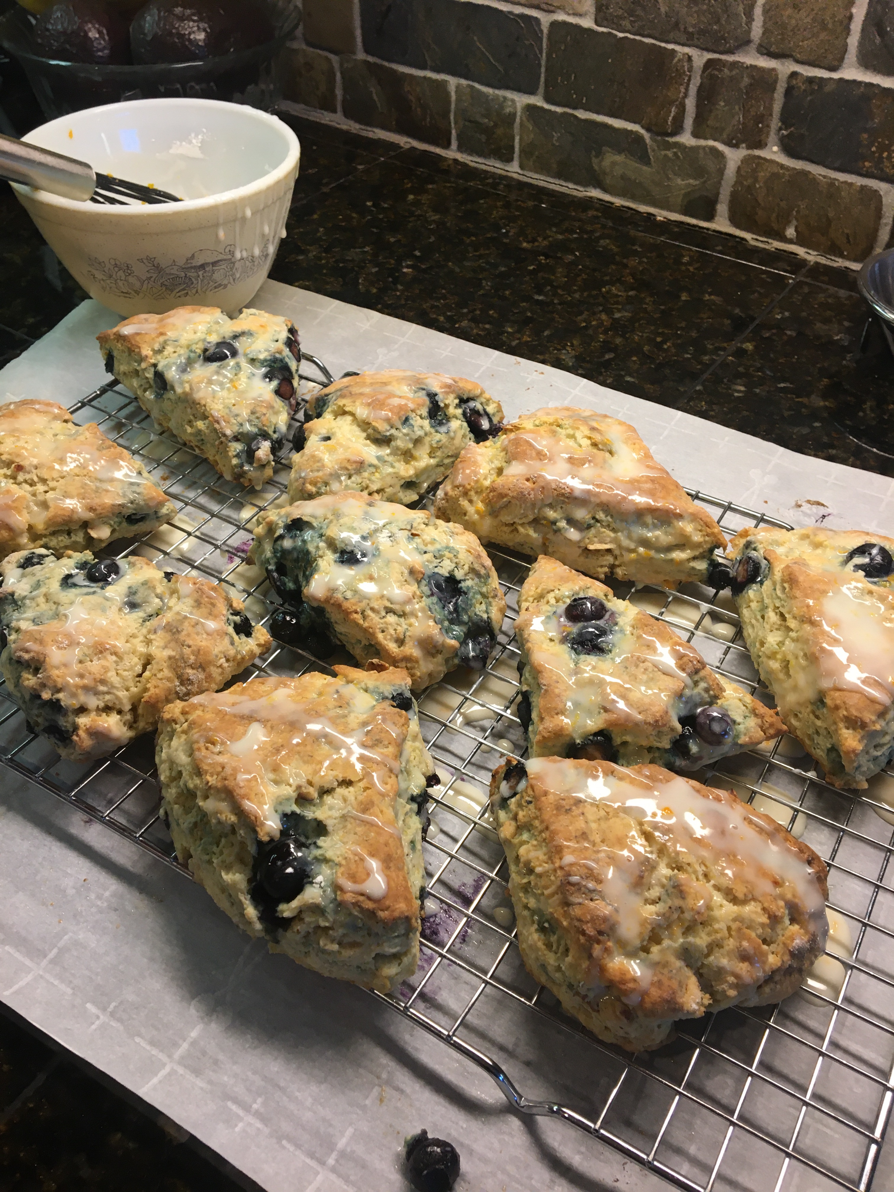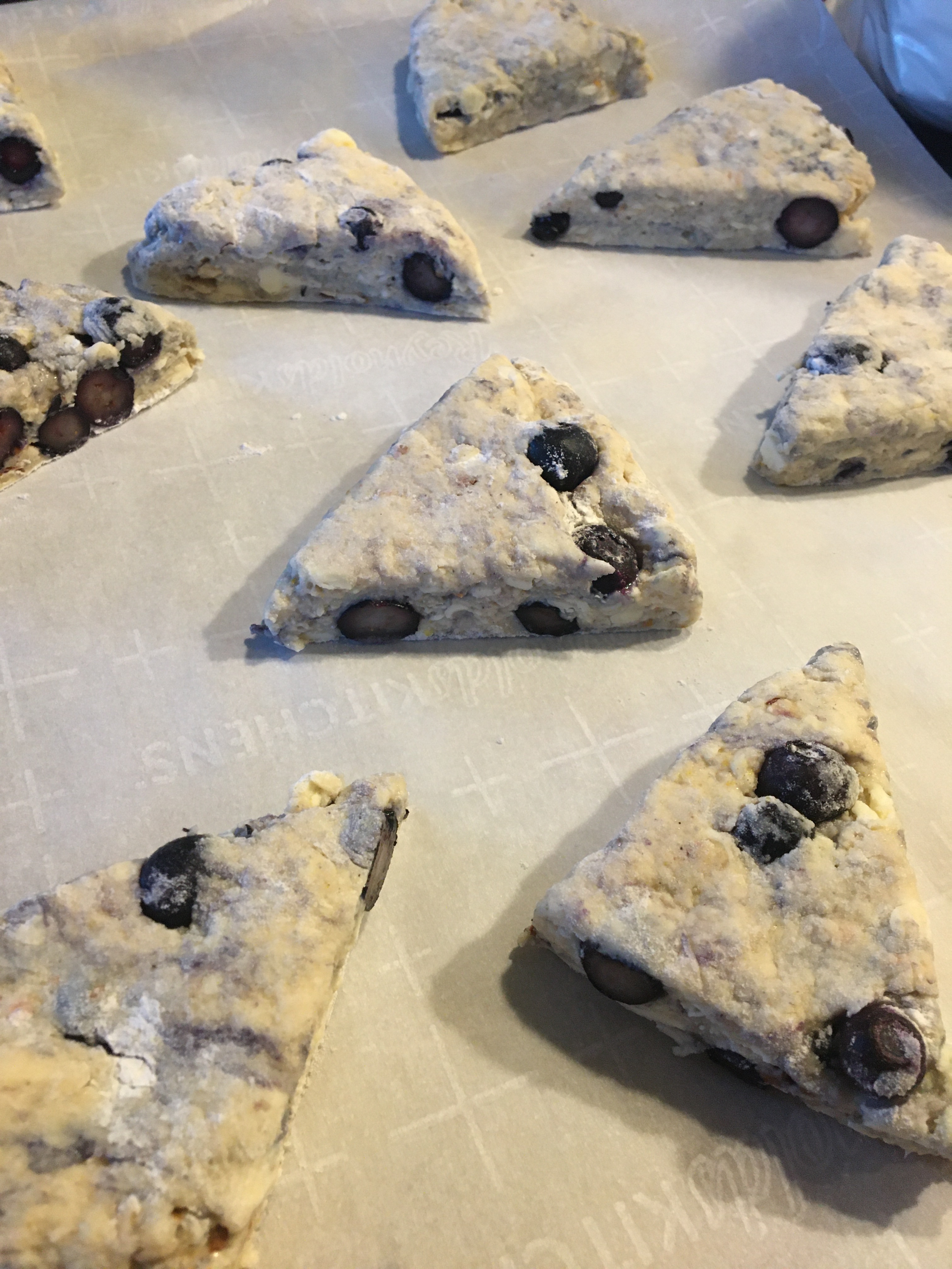 Pour into well and gently incorporate until light dough. Then add blueberries and with hands fold in. Do not knead. This is a light touch. You want butter to stay in pieces to creat the pockets in baking.