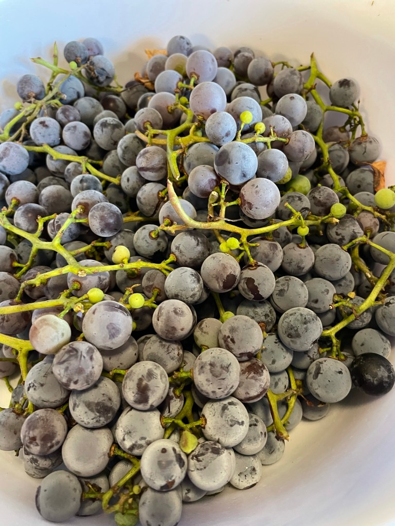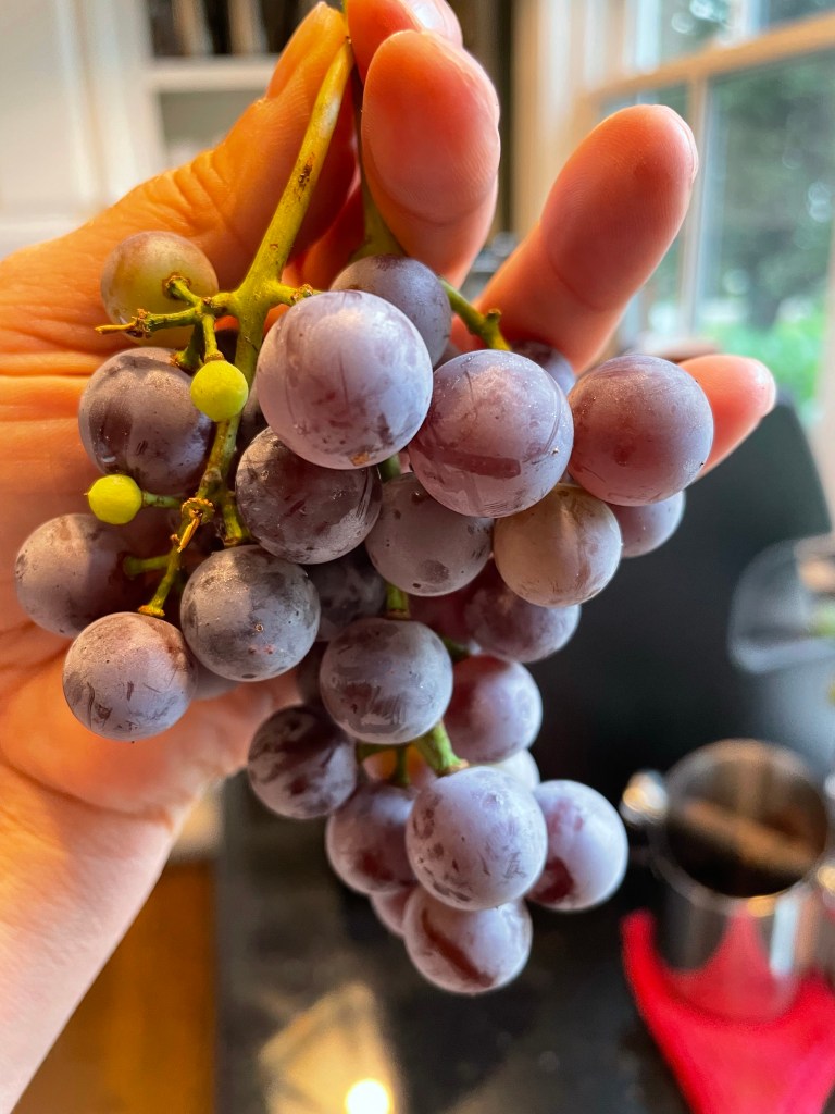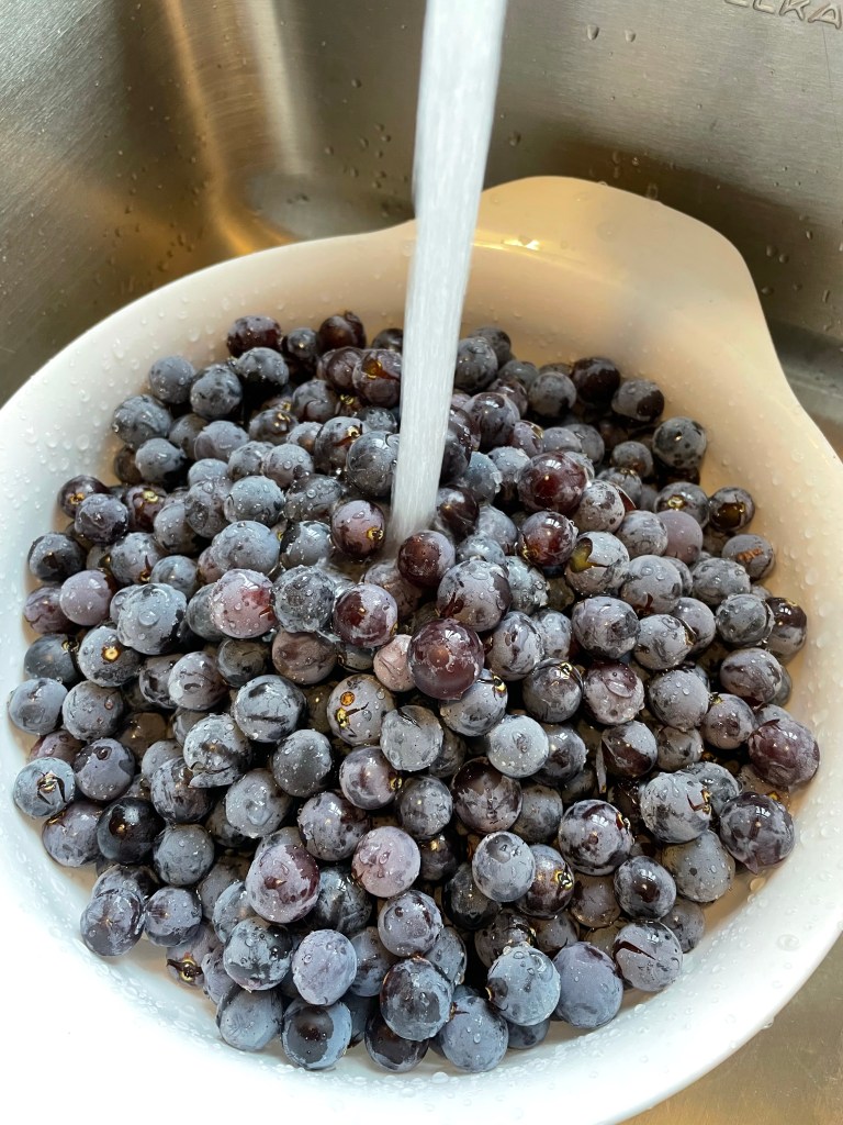 As a kid- we spend the hot summer days playing in the creek, jumping on the huge inflated tractor tire tube or hanging on the porch eating grapes. The hot sun would sugar them so nicely and that sweet aroma would surround you. Dirt under our nails never slowed us down- delicious. So when my brother offered a bucket from the family porch- I instantly went to work capturing that in a jar for winter.