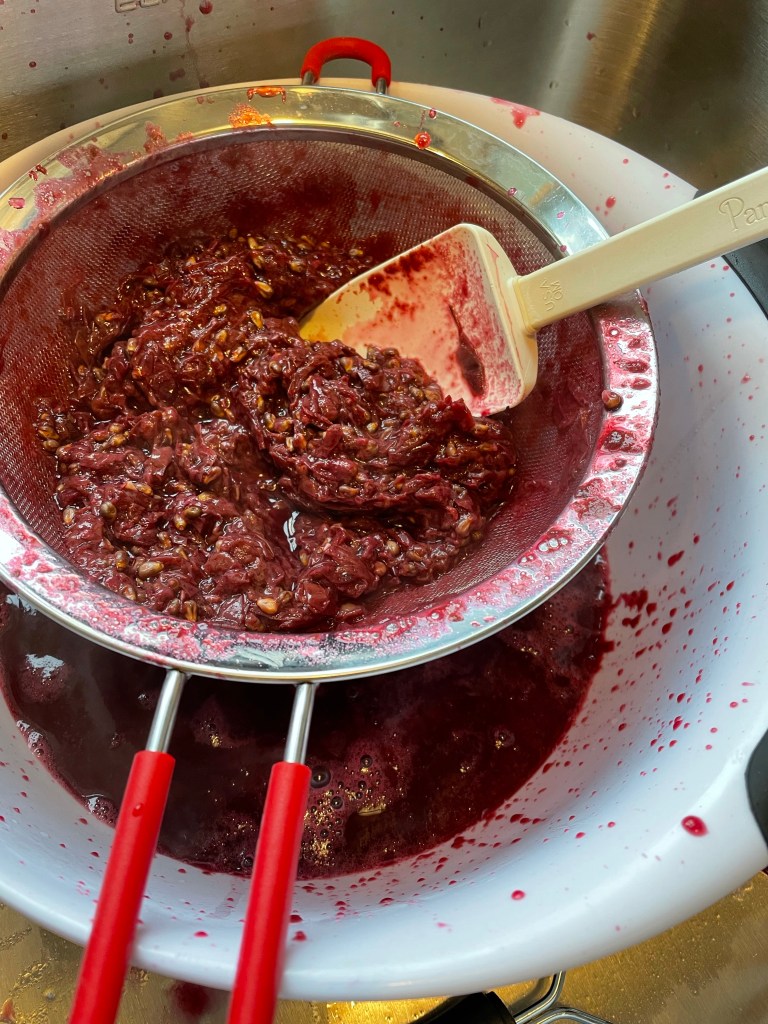 Strain over heat resistant bowl and mash fine pulp and just through strainer. Discard skins, seeds and other items.