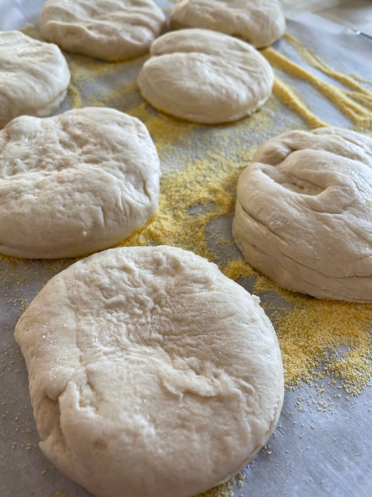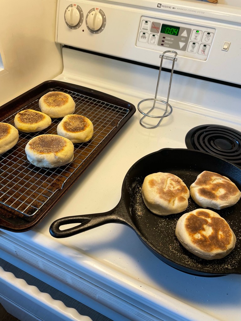 Im a huge fan of the english muffin. I love the cornmeal crunch and nooks and crannies that butter can seep into. I also enjoy topping with my favorite seasonal jams. Spring favorite, there is always my orange marmalade. So when Jason ate the last english muffin- of course I pondered how to make. I will never store buy again. If you have a cast iron skillet you can make and freeze these light fluffy muffins to enjoy any day.