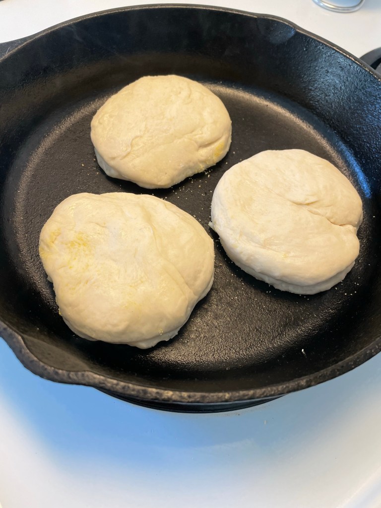 Rest on parchment paper sprinkled with cornmeal. Lightly dust cornmeal on the tops as well. Cover with light flour towel to rise and rest 30 minutes. Start warming black skillet on low to med low. Dust pan with cornmeal. Bake muffins three or four at a time. 5 minutes on each side with a light lid checking after three minutes to be sure to not cook to fast and avoid burning.