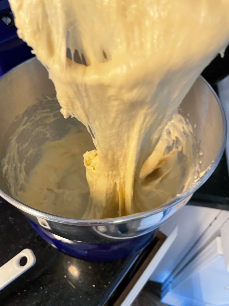 With electric mixer. Take dry ingredients and slowly incorporate wet liquid. Then run on medium and mix for 7 minutes. Dough will be wet and really sticky with a stretch. This step is key and a hand mixer will not paddle the dough accurately.