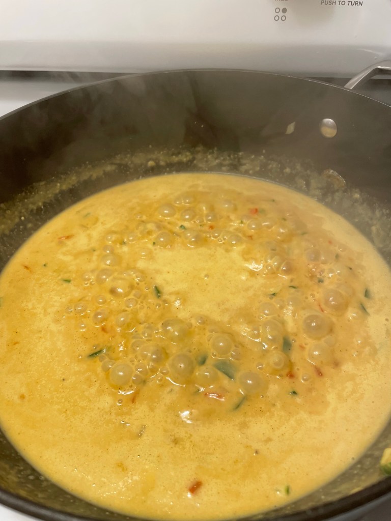 Large sauté pan, add 2 Tbs olive oil and heat to a shimmer. Add veggies and cook until fragrant, salt and pepper lightly. Add garlic and ginger. Cook two min til fragrant. Add seasonings stirring thru. Slowly add coconut cream and 1/4 c water. Blend. Taste and salt and pepper to taste as well as mint and cilantro. ( optionalIf you prefer your curry more gravy heavy, add a Tbs corn starch to the water and incorporate. )