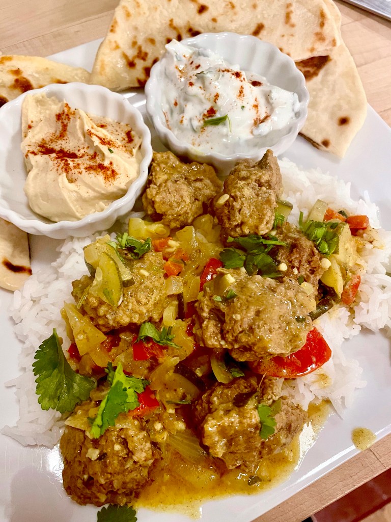 Jason and I really have grown to enjoy cooking together. We share a nice glass of wine, turn up the tunes to match the cuisine, and get going with who does which job. Jason is my savior for kneading dough, mixing, and making meatballs! This was a taste of Mediterranean with cool greek yogurt, homemade Naan , and spicy curry. Naan recipe here. Our pictured was with lean hamburger but I think if you like lamb it would enhance the flavors. Lean pork with beef would be nice as well. Browning meatballs in a skillet first would enhance the color. Its your date- have fun with it! Easy and delicious!