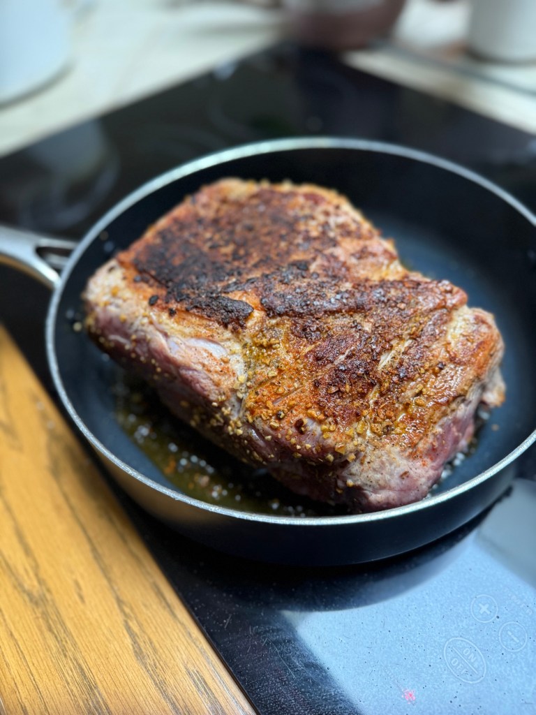 Dry off your roast well and season well on all sides with salts, seasonings, and allow to rest while you heat skillet.