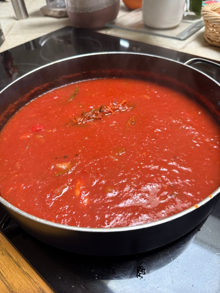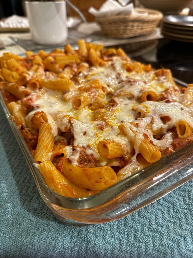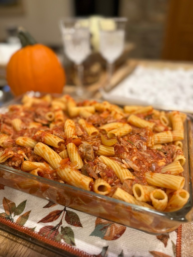 I started my journey of research, looking at recipes of standard rigatoni bake from the 1950s. Looking at the generation of motherly cooks that would take simple ingredients and create multiple comfort food meals. It didn’t take long before I actually found what I was searching for. The standard shoulder butt roast of pork that is slow-cooked could be used for multiple meals in different varieties. It was commonly created for larger families. Bingo! This roast cut is higher in fat and makes a tender, flavorful option that is very affordable. I would not recommend a tenderloin, as this fat content adds to the overall flavor. The shoulder butt roast can be slow-cooked (crock pot) and used for items like simple slices with roasted potatoes, stews, barbecue pulled pork, and now discovered, rigatoni bake. Utilizing garden produce, fresh ingredients, and the star of the show, rigatoni and pork. I did use canned tomatoes, but fresh plum tomatoes processed would be amazing.